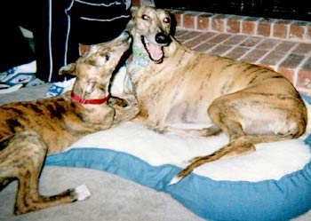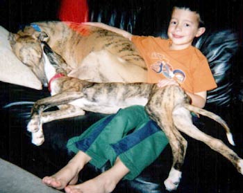 Most of the time, everyone is home so I get to play in the backyard with my boy, too. I can almost run as fast as the big greyhound now! I got my puppy shots on March 3rd and I now weigh 33 pounds. I lost lots of teeth and my new ones are really sharp. Dr. Ellis says I'm in great shape and my ears are immaculate (although I don't know what that word means).