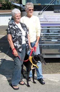 We brought our motorhome from California to the manufacturer's service center near Eugene, Oregon, for repairs on July 11, 2006 and saw a couple (Keith and Sally Woodcox) walk out of their motorhome with THREE greyhounds!!! We were excited (as usual) to go see the dogs, get a "greyhound fix," and meet the folks who had them. We ran to greet them, and all three dogs were friendly and happy to have the attention. I bent to my knees and talked to each one of them. I especially connected with the little black one, named "Hope." She stayed near me after I stood, leaning against my leg. It was love at first sight! Then, to my amazement, we learned that Hope was their foster dog, looking for a home. Later that day, we brought Andrew out on his leash to meet Hope, and got positive signs from both. Before the day was finished, we had filled out our adoption application, and it was on its way to GALT.