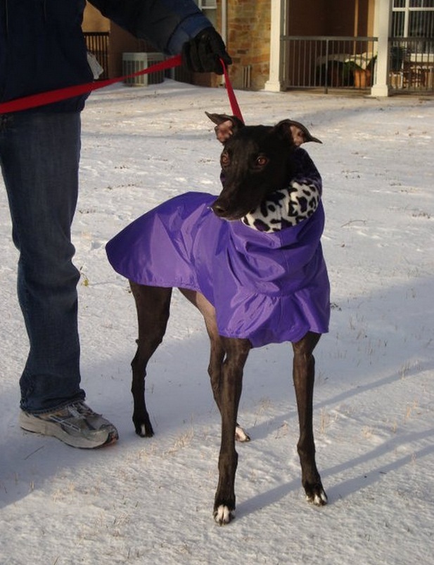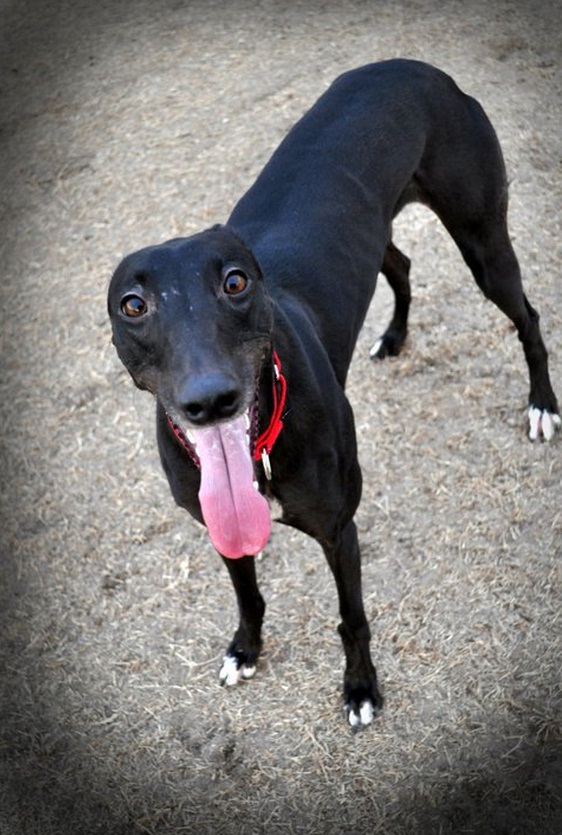 It's her fault we fell in love with her at the Meet and Greet. First, she tried cock-roaching on the concrete floor of the Petco. Then, she said hello to everyone we passed as we took her for a stroll in the parking lot, batting those beautiful brown eyes in sweet innocence. Now, this 64-pound, 18-month-old black beauty shares our home. Like most greyhounds, she's the lazy type with a healthy dab of spunk.
