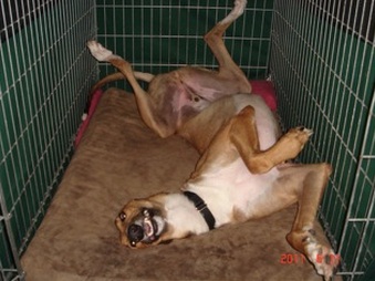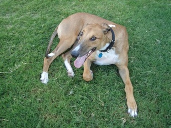 Pedro came to our house as our first foster greyhound. I had no idea what I was getting into when I picked up this huge, very unruly 1-1/2 year old greyhound from BARK on March 26th. Susie asked me to run him by VCA after I picked him up so they could check on his "happy tail." I learned that you don't leave Pedro alone for even 10 seconds. When I arrived at the vet, all I did was run to the front door of the vets office to tell them we were there and by the time I got back to my car (literally 15 seconds) he had devoured the kibble that BARK had provided me so I could slowly change his food. Well, so much for that idea! It was GONE!