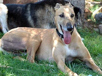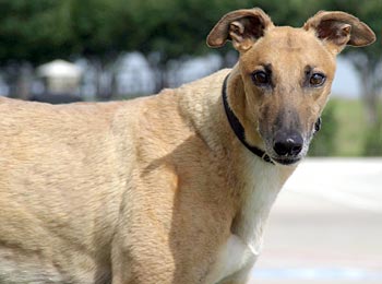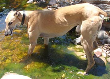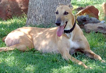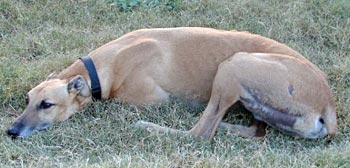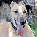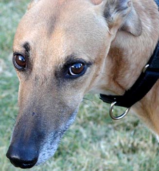 After the waggy tail, the next thing you notice about Achilles is his massive neck. Since he has no races on record, perhaps Mr. Achilles was the Sumo wrestler of the kennel! He is quite a big boy, weighing in at about 84 pounds – and his strength could rival that of Stone Cold Steve Austin. If this boisterous boy and my other greys get a little rough at playtime, I just pull out the muzzles -- and everyone is happy.