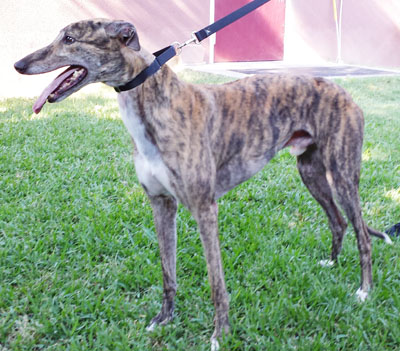 Askew, aka Let Me Ask You, is a 3½-year-old brindle male born October 4, 2009. His sire is Super Lee and his dam is Up N Coming Idol. Askew has 85 races on record at Greyhound-data.com. He started his career at Bluffs Run, IA on May 5, 2011, moved to Wheeling Downs, WV, and then finished up in Pensacola, FL on July 13, 2013.