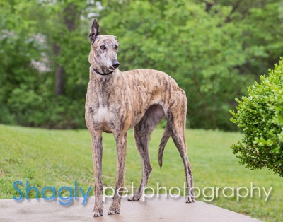 Bye, aka MRL Goin Bye Bye, is a 5 year old brindle female born January 9, 2013. Her sire is Bob's Skeet and her dam is HS Babe. Bye has 12 races on record at Greyhound-Data.com, and then went on to be a brood mom. Five of her pups were registered, and the sixth, Madilyn who is not individually registered, came with her to the GALT family. Bye is a beautiful girl inside and out. It has not been determined yet if Bye is small animal or cat tolerant.