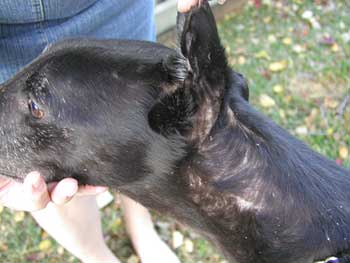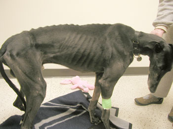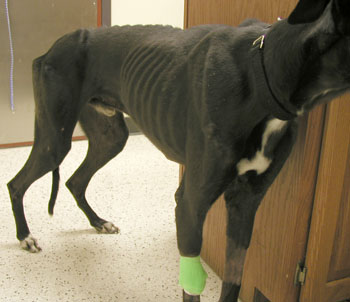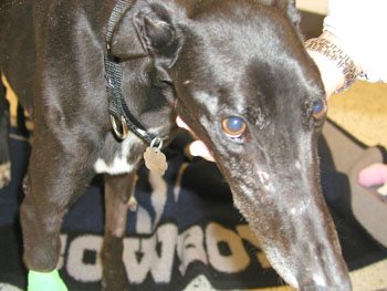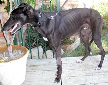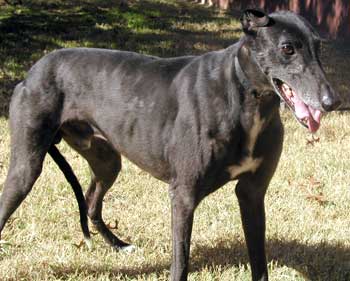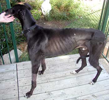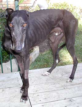 Skittles, aka Sandhill Skillet, is a 5½-year-old black male greyhound, born June 9, 2001. His sire is Grenade, making his grand-sire Molotov, and his dam is Starlight Kissy. Skittles was found as a stray on a farm north of Hillsboro on Thursday, October 26. According to Greyhound-Data.com, Skittles finished the last of his 259 races this past June 19, 2006, at Daytona Beach, Florida. His whereabouts since then to now are unknown, although the NGA owner of record said he had given Skillet to a man to use for rabbit hunting, who lives on the Oklahoma/Texas border, because he was an "old dawg." He arrived twenty-four pounds below his racing weight and severely malnourished, which as we all know can be deadly in itself.