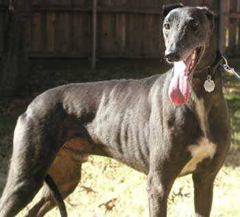 Skittles has settled into his foster home, with three other greys and a lab, and is doing very well. He is resting a lot, and "tottering around" like a champ, receiving five small meals a day, several medications, vitamins, and lots of love! You would never believe this boy has never been in a home before – he is the PERFECT dog! He woke his foster mom up early this morning "crying"...she took him outside, of course, but what he wanted was to eat!