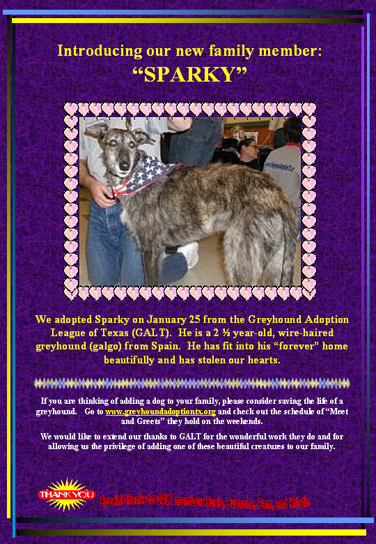Meet Llop, pronounced "Yop", a Spanish Galgo (greyhound) from Barcelona, Spain who arrived December 18 to GALT's family of greyhounds from SOS Galgos. GALT was contacted through a mutual friend, Dr. Suzanne Stack, about a galgo that had the opportunity to accompany a volunteer from SOS Galgos who was returning to Texas. Because the plight of the greyhound in Spain is absolutely atrocious, every chance is taken to transport them out of the country. Anna Clements, co-founder of SOS Galgos, contacted Dr. Stack about Llop's possible transfer to the US, and Dr. Stack, in turn, contacted GALT. We are proud to welcome Llop into GALT's family as our second Galgo; Keppy was the first!