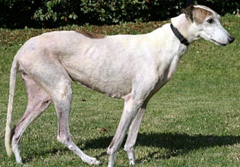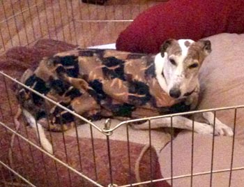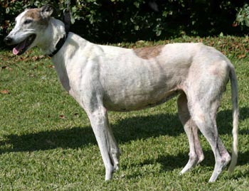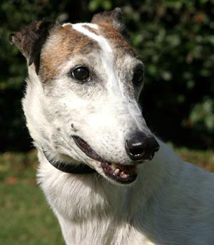 Patty, aka Paddy's Glory, is 12½-year-old, Irish-bred, white and brindle female born February 5, 1997. Her sire is the famous Irish-bred Shanless Slippy, and her dam is Irish-bred Fossabeg Maid. Patty has no races to her credit on Greyhound-data.com. Patty's call was to be a brood, and she has 17 offspring from Flying Train, Greys Statesman, and He’s My Man. Patty arrived to GALT from a farm closing in Texas. She has been medically processed, with an extensive dental, loosing more teeth than she kept. Patty has lumbar sacral stenosis, and is receiving daily medication, which will be required for the rest of her life. It is not known at this time if Patty is small animal or cat tolerant.