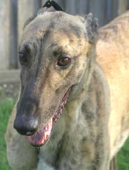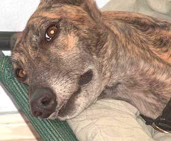 Walt, aka GLB's WalkyTalky, is a three-year-old handsome red brindle male born March 28, 2001. Walt's sire is Gable Dodge and his dam is GLB's Too Sweet. Walt's racing career was all spent here in Texas where he started at October 2, 2002, at Gulf Greyhound Park, then to Valley Race Track in Harlingen, and finished at the Corpus Christi track on July 9, 2003. His whereabouts since that time are unknown. Although Walt gets along well with other dogs, it has not been determined if he is small animal or cat tolerant at this time.