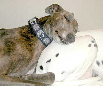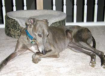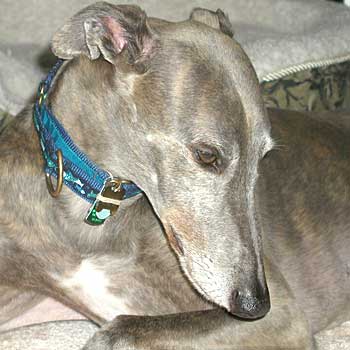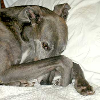 Xander, was the most beautiful, gentle soul I have ever known, with a look like no other greyhound - he was beautiful, inside and out. He was an owner release, and the day I went to pick him up to foster, I could not believe my eyes. I have always told everyone that commented on his beauty that he could have been purple, and we still would have had a bond like no other. I took one look into his eyes that day and I knew that I was going to fail fostering!! I didn't let anyone else know what I was feeling, but in my heart, I knew he wasn't going anywhere. Xander showed me what a gentle, quiet and intelligent soul he was. He was the kind of greyhound that was regal and stoic, not silly and playful. He was loyal and undemanding - my friend and my companion. His sudden departure from this world will always be a mystery to me, but I have been blessed to have had him in my life for 2½ years. I know that he is happy and healthy and no longer afraid of thunderstorms. There is a huge hole in my heart. I will miss you forever, Xander.